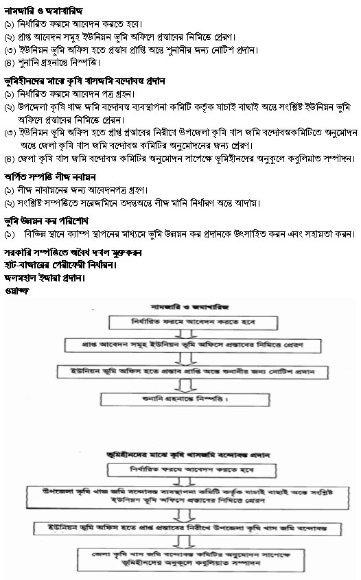 ৪) ভূমিহীনদের সরকারি খাস জমি বন্দোবস্ত সংক্রান্ত কাজ।